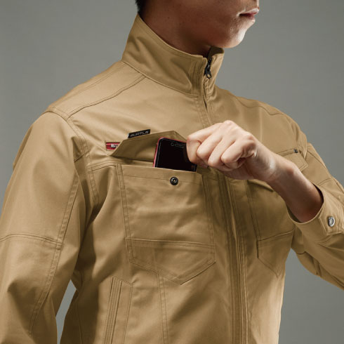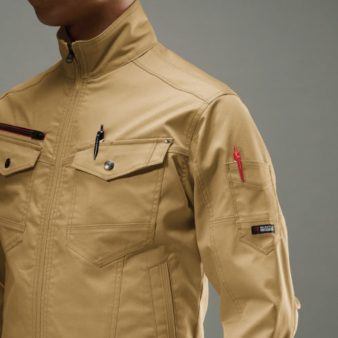 バートルデザインを象徴するユーティリティ性の高いレッドファスナーがシンボリックに映える。