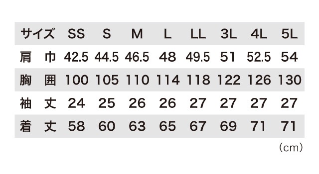 | 袖丈 | 24 | 25 | 26 | 26 | 27 | 27 | 27 | 27 |