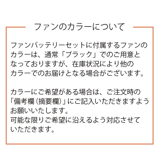 注意:ファンFA23112専用バッテリーです。既存ファンとの互換性はありません。充電の際は専用アダプターCG23411をご使用ください。