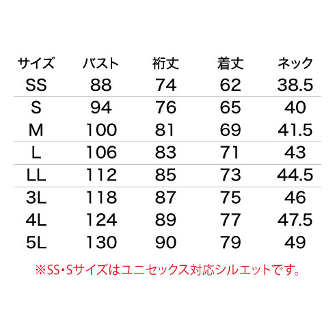 | サイズ | SS | S | M | L | LL | 3L | 4L | 5L |