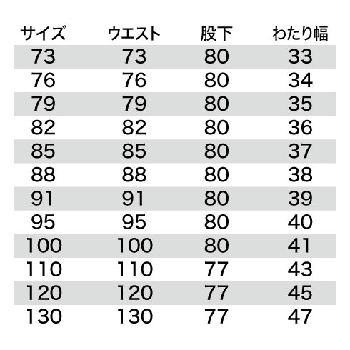 | ウエスト | 73 | 76 | 79 | 82 | 85 | 88 | 91 | 95 | 100 | 110 | 120 | 130 |