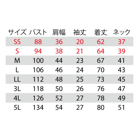 | サイズ | SS | S | M | L | LL | 3L | 4L | 5L |