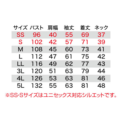 | サイズ | SS | S | M | L | LL | 3L | 4L | 5L |