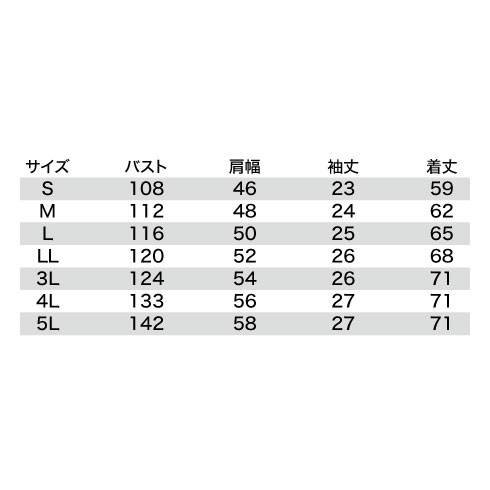 | 着丈 | 59 | 62 | 65 | 68 | 71 | 71 | 71 |