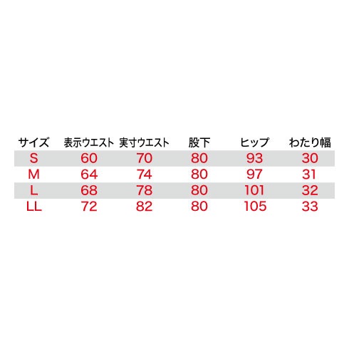 | 実寸ウエスト | 70 | 74 | 78 | 82 |
