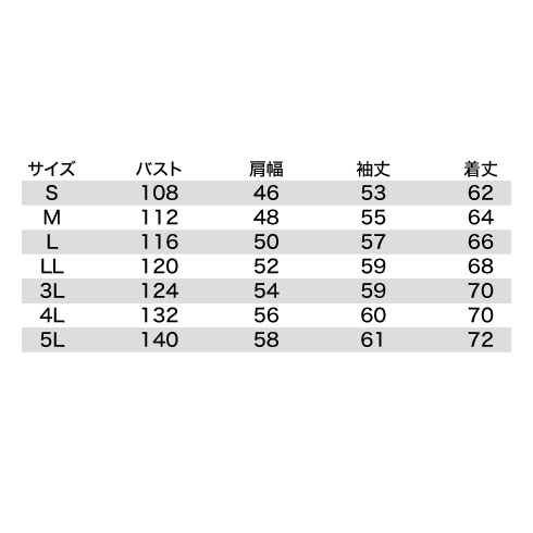 | 着丈 | 62 | 64 | 66 | 68 | 70 | 70 | 72 |