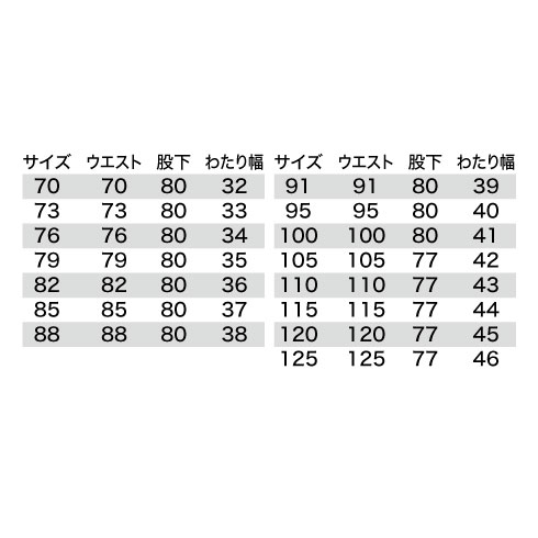 | ウエスト | 70 | 73 | 76 | 79 | 82 | 85 | 88 | 91 | 95 | 100 | 105 | 110 | 115 | 120 | 125 |