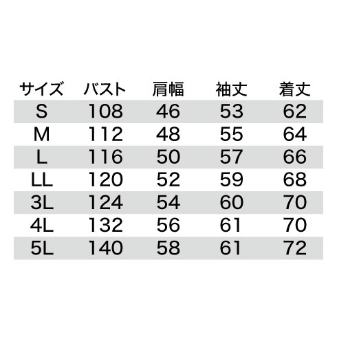 | 着丈 | 62 | 64 | 66 | 68 | 70 | 70 | 72 |