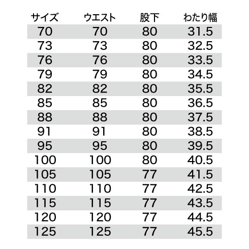| ウエスト | 70 | 73 | 76 | 79 | 82 | 85 | 88 | 91 | 95 | 100 | 105 | 110 | 115 | 120 | 125 |