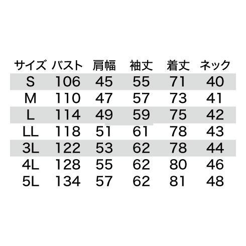 | 袖丈 | 55 | 57 | 59 | 61 | 62 | 62 | 62 |