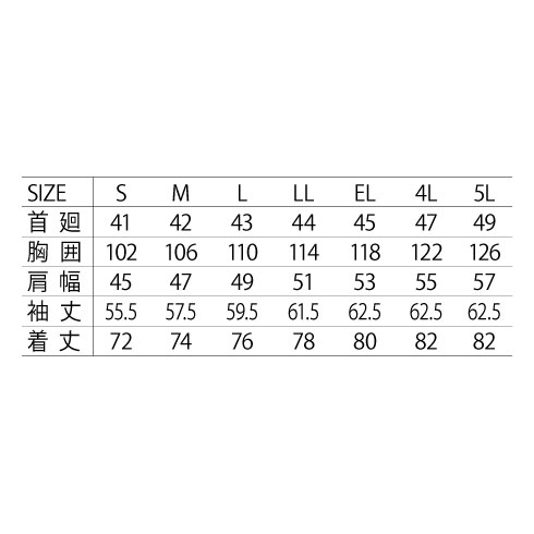 | 袖丈 | 55.5 | 57.5 | 59.5 | 61.5 | 62.5 | 62.5 | 62.5 |