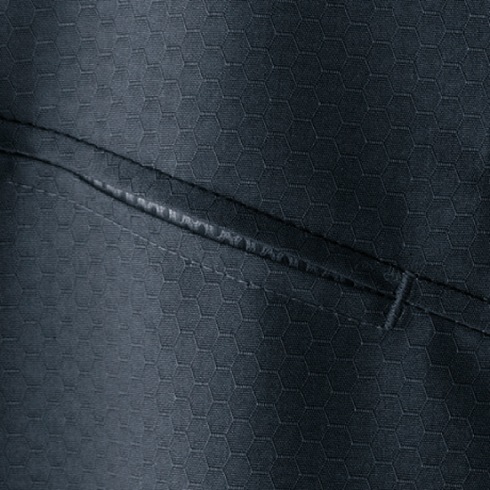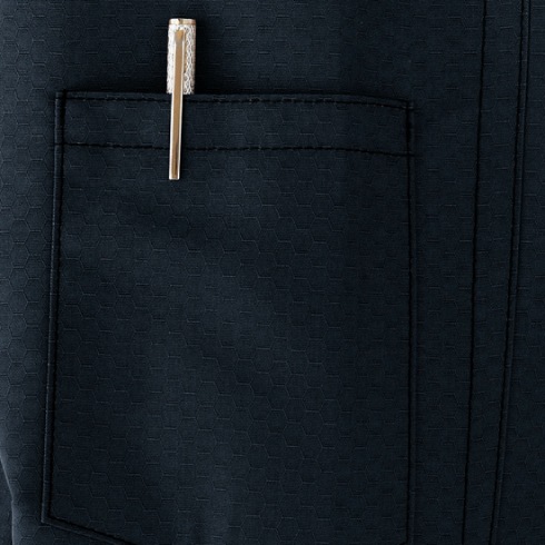 カジュアルウェアに多く使用される新素材「ハニカムリップストップ」を採用しています。凸凹とした蜂の巣状の斬新な模様と5連アイレットやデザインファスナーがカジュアルさを演出します。二重ポケットやペン差し、ループなどの基本的な性能も兼ね備えたカジュアルワークウェアです。