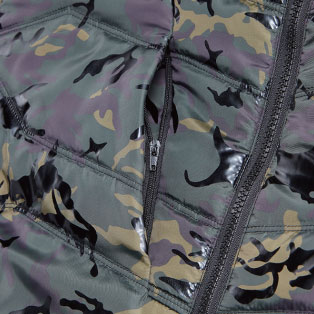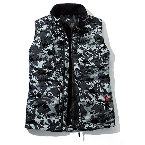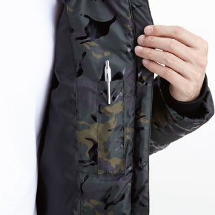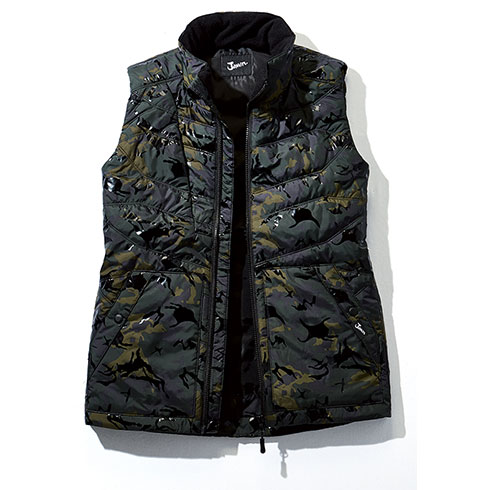カモフラ柄と光沢感を融合させてデザイン性を追求した軽量防寒。