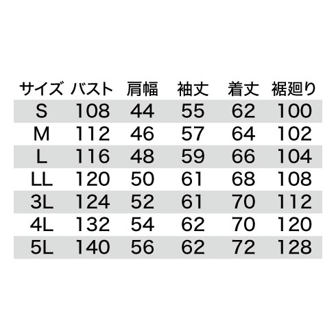| 袖丈 | 55 | 57 | 59 | 61 | 61 | 62 | 62 |