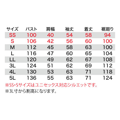 | サイズ | SS | S | M | L | LL | 3L | 4L | 5L |