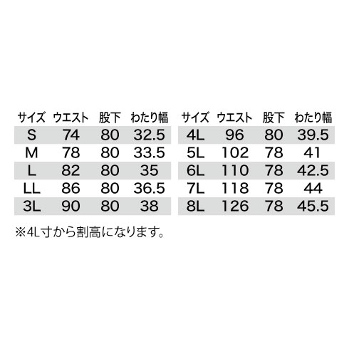 | ウエスト | 74 | 78 | 82 | 86 | 90 | 96 | 102 | 110 | 118 | 126 |
