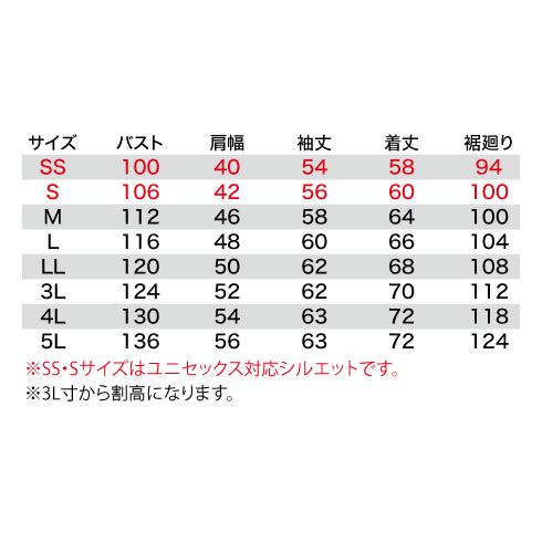 | サイズ | SS | S | M | L | LL | 3L | 4L | 5L |