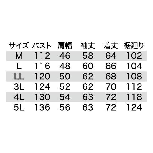 | 着丈 | 64 | 66 | 68 | 70 | 72 | 72 |