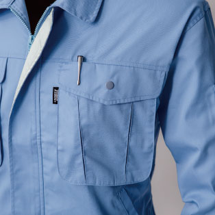 ・胸ポケットの一部にメッシュ素材を採用している、通気性の高い仕様