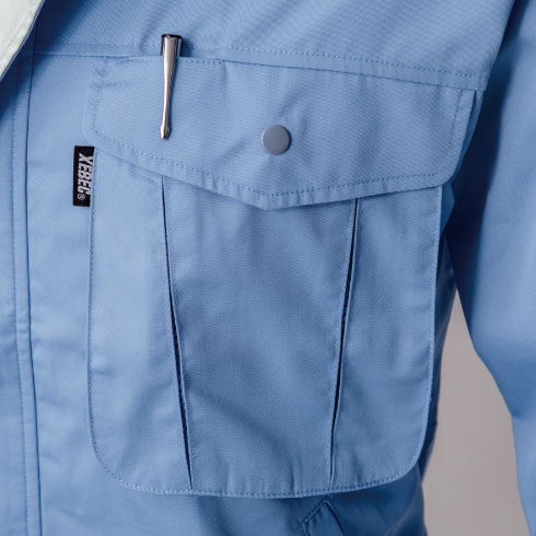 左胸ポケット上部に、外からワンアクションで出し入れができるペン差し付き。