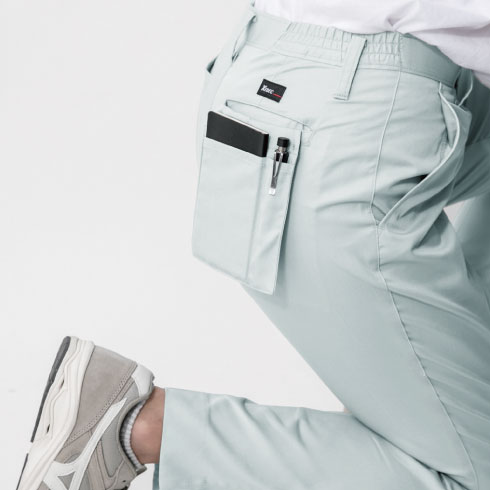 立ち座りが多い作業でも、ポケットに入れた携帯電話やスマートフォンに負荷をかけずに収納することができます。