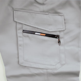 ●右カーゴポケットのマルチカラーが映えるファスナーがデザインのポイント
