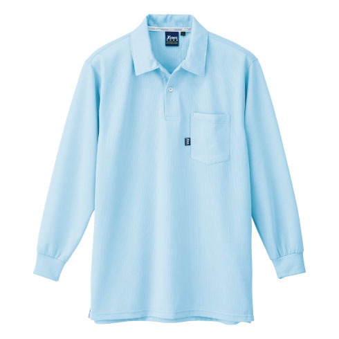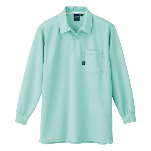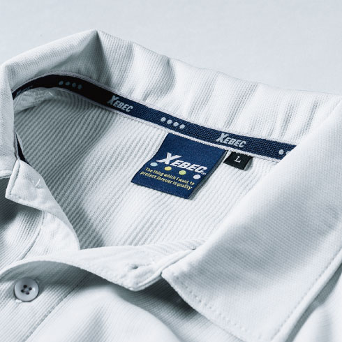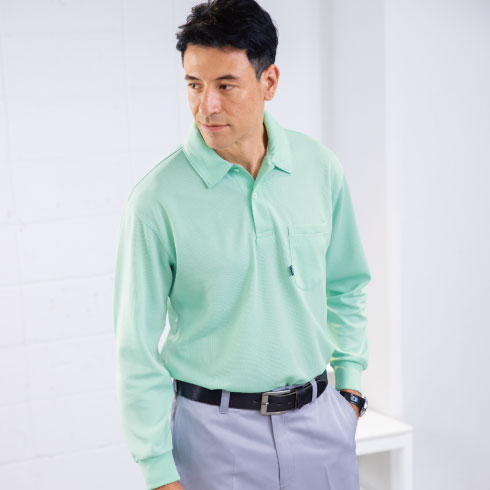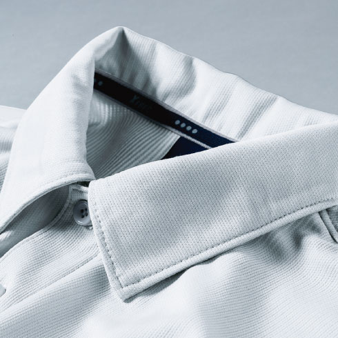 表面はポリエステル、裏面に綿混糸を配置し、吸水性の良い綿の心地いい肌ざわりとポリエステルの軽さを兼ね備えたポロシャツ。共生地の襟できちんとした印象。