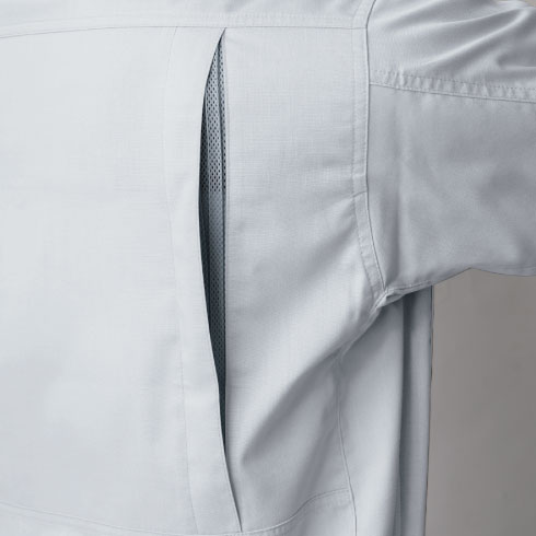 背中、3倍に広がり動きやすさをサポートするジーベック独自のプリーツロン採用。