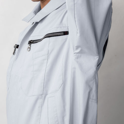 吸汗性・速乾性に優れたオリジナル二層構造糸を使用し、シャープな胸ファスナーデザインにまとめたスタイリッシュなワークウェア。
