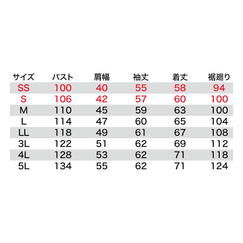 | サイズ | SS | S | M | L | LL | 3L | 4L | 5L |