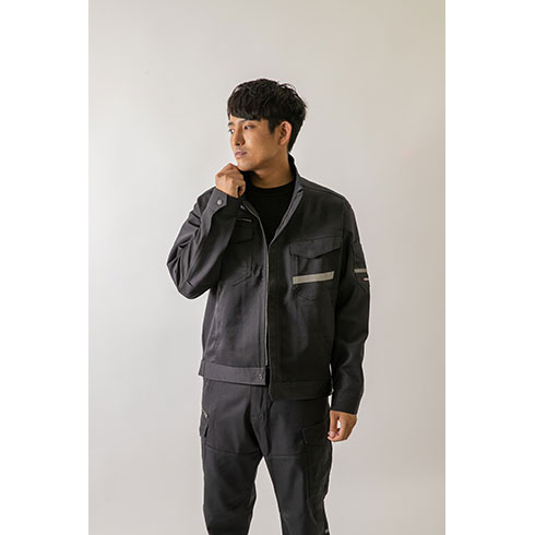 アクティブなシーンでも快適なフィッティングが可能なポリエステルストレッチツイル素材を用い、程よくテーパードしたシルエットがシャープな企業ユニフォームを演出。