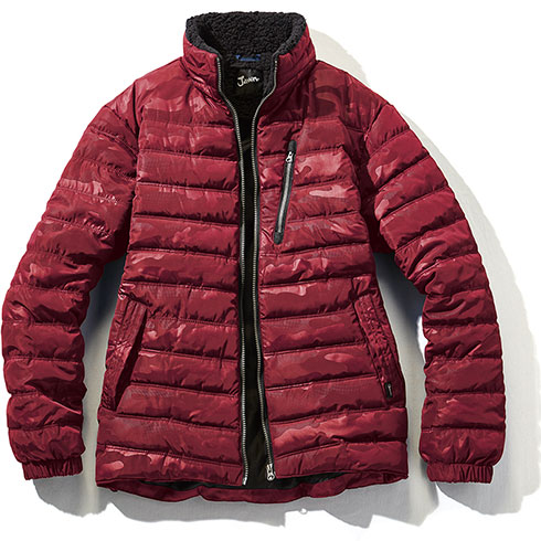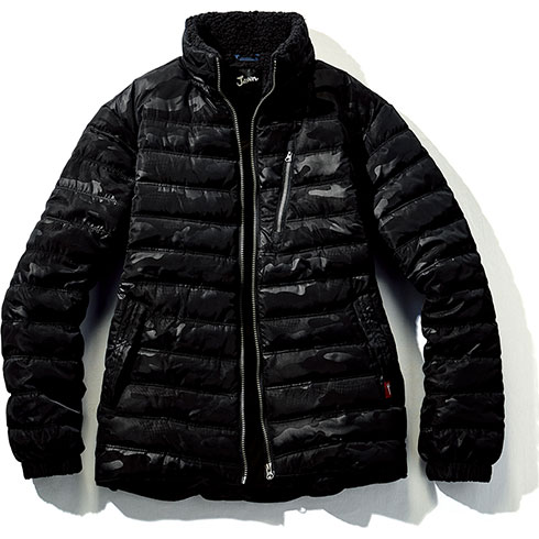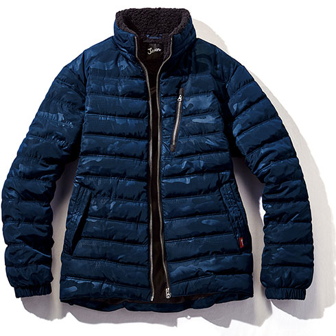 カモフラ柄のエンボス加工が個性を演出する軽量防寒