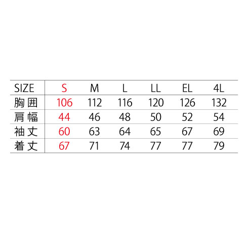 | サイズ | S | M | L | LL | EL | 4L |
