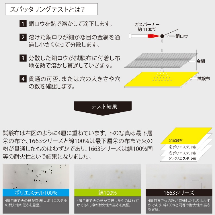 ●綿100%と同等の耐火性(※スパッタリングテスト)