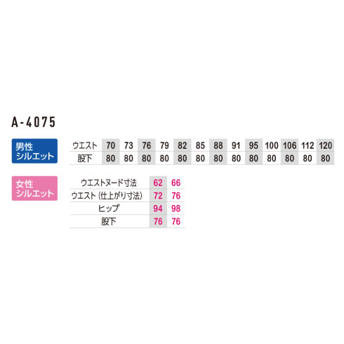 | ウエスト | 70 | 73 | 76 | 79 | 82 | 85 | 88 | 91 | 95 | 100 | 106 | 112 | 120 |