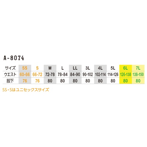 | ウエスト | 60-66 | 66-72 | 72-78 | 78-84 | 84-90 | 90-102 | 102-114 | 114-126 | 126-138 | 138-150 |
