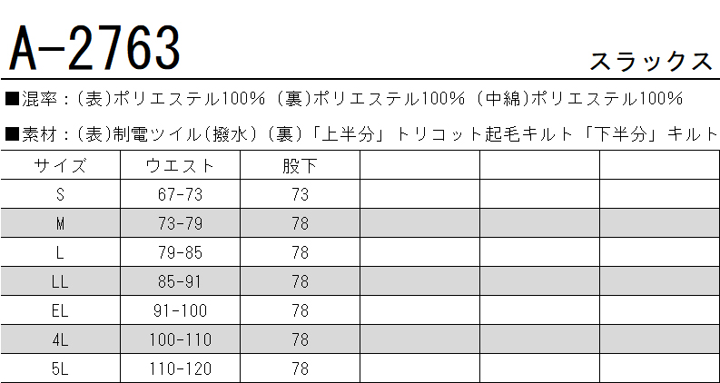 コーコス信岡 CO-COS A-2763 防寒 防寒着 釣り バイク 防寒スラックス 脇シャーリング 秋冬 制電防止 撥水加工 ポリエステル100%|作業着・作業服の通販ワークキング【公式】