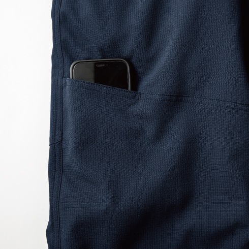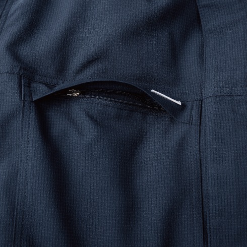 ファスナー付き胸ポケットやスマホ用ポケット、金具類も表面に出ていないプロ仕様の本格夏ツナギです。
