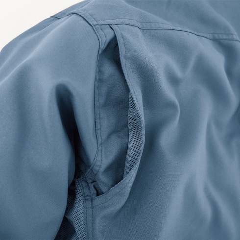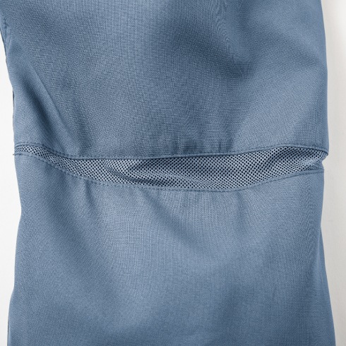 通気性の高いメッシュ生地を、袖下と背中プリーツ・膝裏に使用して衣服内のムレを軽減させました。