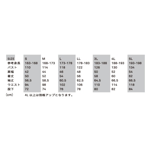 | サイズ | S | M | L | LL | 3L | 4L | 5L |