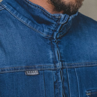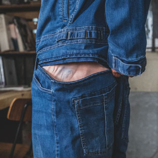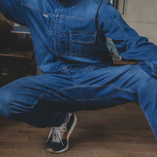 見慣れた定番のデニムツナギですが、着ると違いがわかる超絶ストレッチに加えて軽やかさもあり、ツナギの概念を覆す着心地です。