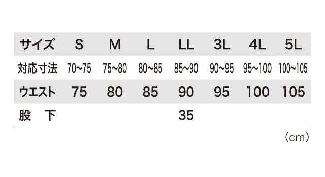 | ウエスト | 75 | 80 | 85 | 90 | 95 | 100 | 105 |