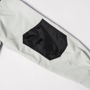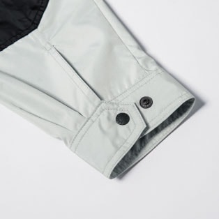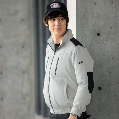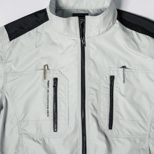 空気の漏れにくい高密度タフタを使用し、配色の肩当て、ヒジ当ての補強布が付いたヨーロピアンテイストの長袖の空調服®